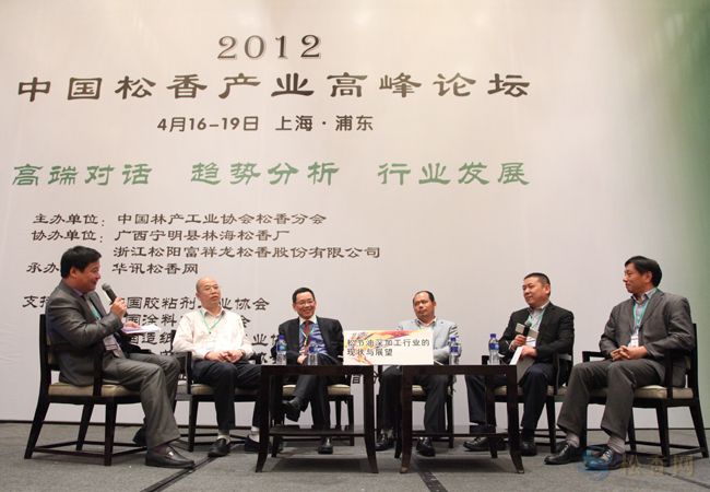 4月17日,2012中国松香高峰产业论坛在上海绿地东海岸豪生酒店三楼豪生厅举行,本次会议共四个分论坛,在上午举行的第一分论坛《中国松香出口形势分析》中,来自广东林产工业公司副总经理张金明、劳特化工(上海)有限公司亚太区采购经理顾松、中土畜三里香精香料有限公司总经理助理胡文太、广西长今源化学品有限公司总经理张淑琴、广西梧州市瑞通贸易有限公司董事长周楚平等作为论坛嘉宾在主席台就坐,并从国外市场对中国松香需求的判断及发展变化,中国松香对世界松香市场的影响及话语权,国外脂松香生产及成本价格价格情况及对中国松香出口的影响,松香深加工产品的出口状况等方面对松香出口形势进行详细分析。