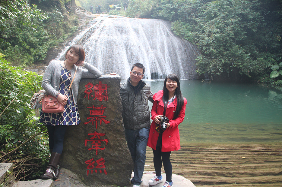 站在瀑布前,涛歌左拥右抱,心里乐得眼眯成了一条缝