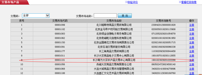 第三步:进入银商银权转账页面后,在交易市场产品中,找到序号为9、交易市场代码为00001101的长沙南方大宗农产品交易中心有限公司进行注册操作,如图所示: