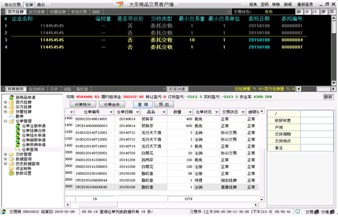 1.1注册仓单:卖方联系交易中心,提交商品的入库单,交易中心后台审核后签发仓单给卖方。然后卖方登录客户端,点击“挂牌”——“仓单管理”——“仓单注册申请”——“未申请”,这里面列出了交易中心已签发的仓单,选择需要挂牌的仓单进行注册申请;