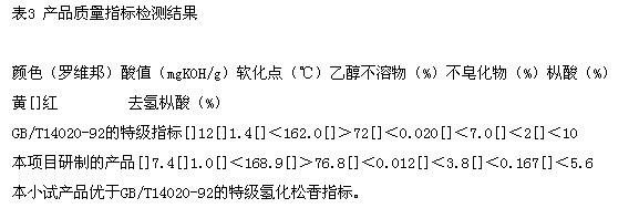 根据国家标准GB/T14020-92的试验方法,检测研制的氢化松香产品结果见表3。