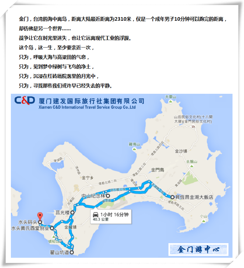 4、客户现场确定参加商务考察的,请尽量赶在11月24日16:00前到达会议酒店与会务组报名,因为17:00后将不能办理赴台湾相关证件,故超过时间段会务组将不再受理报名参加台湾金门商务考察活动。